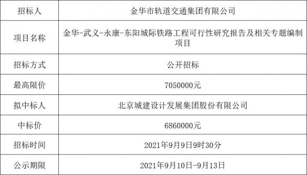 金華-武義-永康-東陽(yáng)城際鐵路工程可行性研究報(bào)告及相關(guān)專題編制項(xiàng)目中標(biāo)公示