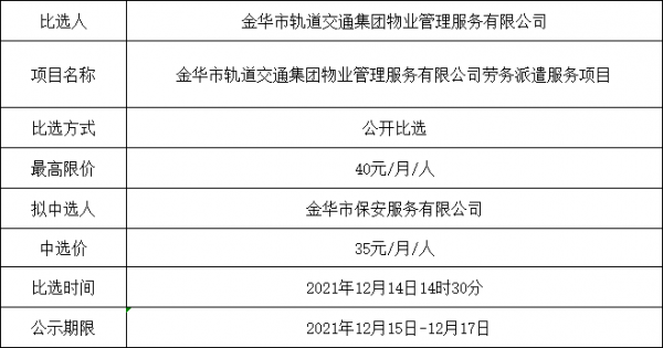 金華市軌道交通集團物業(yè)管理服務有限公司勞務派遣服務項目的中選公示