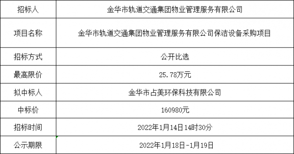 金華市軌道交通集團(tuán)物業(yè)管理服務(wù)有限公司保潔設(shè)備采購項(xiàng)目中選公告