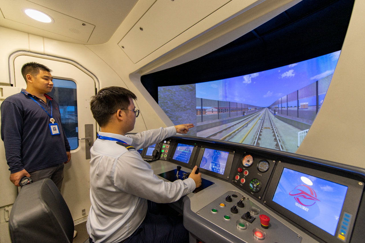 6月11日,在浙江省金華市金義東市域軌道交通工程塘雅車輛段,青年職工選手在參加軌道交通模擬駕駛項目技能比武。