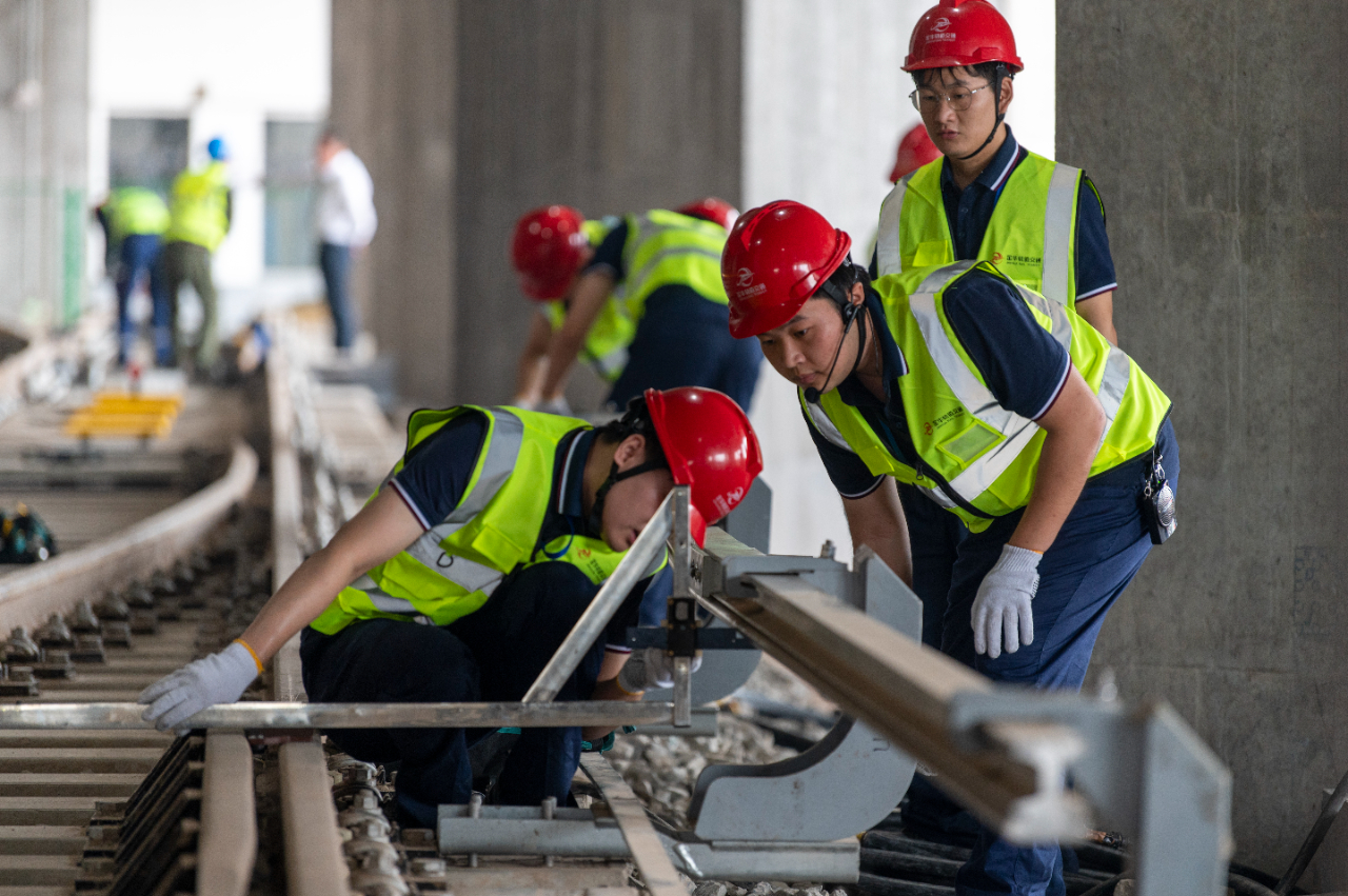 6月11日,在浙江省金華市金義東市域軌道交通工程塘雅車輛段,青年職工選手在參加軌道交通更換鋼軌接頭夾板項目技能比武。