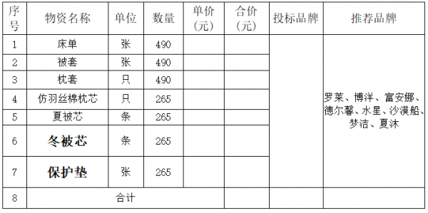 致:各參選人 比選人現(xiàn)將參選人提出的問題及招標(biāo)文件需要澄清、修改、補(bǔ)遺、答疑的內(nèi)容,統(tǒng)一答復(fù)你們,請(qǐng)認(rèn)真研究。本次澄清、修改、補(bǔ)遺、答疑若與招標(biāo)文件不一致之處,以本次補(bǔ)充文件為準(zhǔn)。一、問:報(bào)價(jià)明細(xì)表中有推薦品牌,其他品牌是否可以參與? 推薦品牌均為家紡產(chǎn)品的品牌,而貴公司所需產(chǎn)品均為酒店布草產(chǎn)品,與家紡產(chǎn)品存在差異,且一般酒店布草的同質(zhì)量產(chǎn)品在技術(shù)標(biāo)準(zhǔn)上均優(yōu)于甲方產(chǎn)品。建議貴公司可以放開參與品牌的范圍,允許類似我司這樣的專業(yè)酒店布草生產(chǎn)廠家參加。答:甲方推薦品牌的,供貨產(chǎn)品品牌須在技術(shù)需求中推薦品牌范圍內(nèi)或相當(dāng)于(或優(yōu)于)推薦品牌。